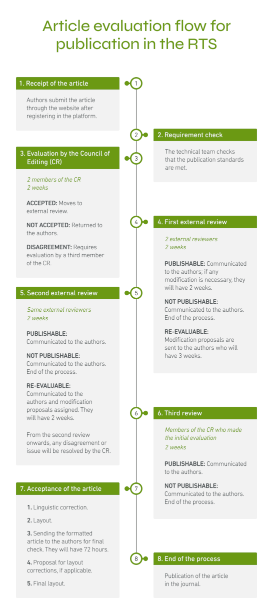The external review process, involving a double blind peer review system, begins once the Editorial Board has proposed the respective reviewers to be appointed for each paper, according to their specialist field. Communication with said reviewers shall be conducted through the RTS technical support team and the former shall be given the journal's review guidelines. The review should take into consideration: the originality of the text, the quality and rigour of the work, the opportunity and relevance for social work and social intervention, presentation and the wording of the text, and the suitability of the bibliography cited. All of these aspects are set out in the review guidelines that will be given to the reviewers, which are also published on the website to assure transparency. In each issue a list of the reviewers involved in its preparation will be published.